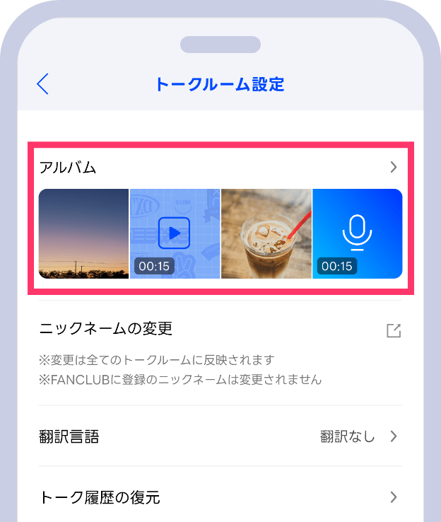 メンバーから届く写真・動画・音声がアルバムに保存されます。